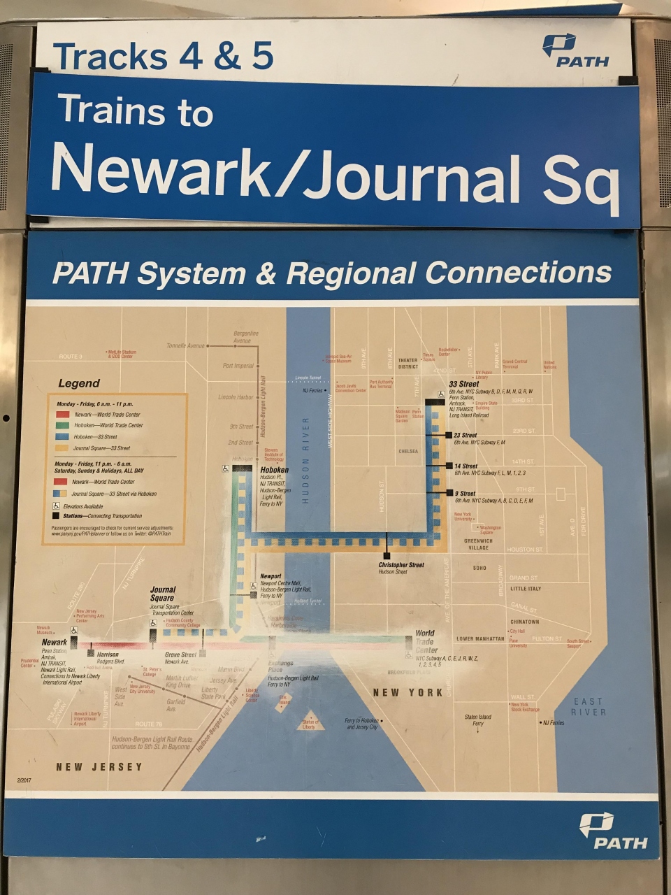 NY側はワールドトレードセンター(World Trade Center Station)駅と33丁目(ブロードウェイ)に乗り入れているが、日曜日は運行経路が異なり、ワールドトレードセンター駅方面の電車は運休になり、駅自体が閉鎖になるので注意が必要。