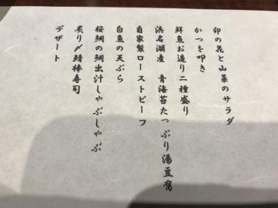 最初に出てきた卯の花と山菜のサラダ、メインの桜鯛の鯛出汁のしゃぶしゃぶは3,980円程度のコースではなかなか出会えないかも。ただ、鯛出汁しゃぶしゃぶは締めの雑炊が無いのが残念。