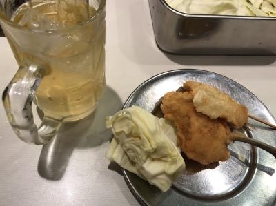 松葉の串カツは昔ながらの「揚げ置き」スタイル。でも冷たくなっているわけでは無く、サクサク感も残っている。バットに無いネタは注文して揚げてもらう。当然ながらソースの2度漬けは厳禁。