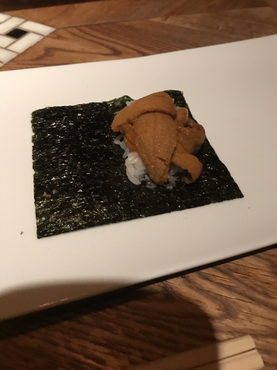 おススメは焼ウニ。少しだけ焦げ目を付けた雲丹が海苔とおこげの上に…濃厚、でもくどく無い。