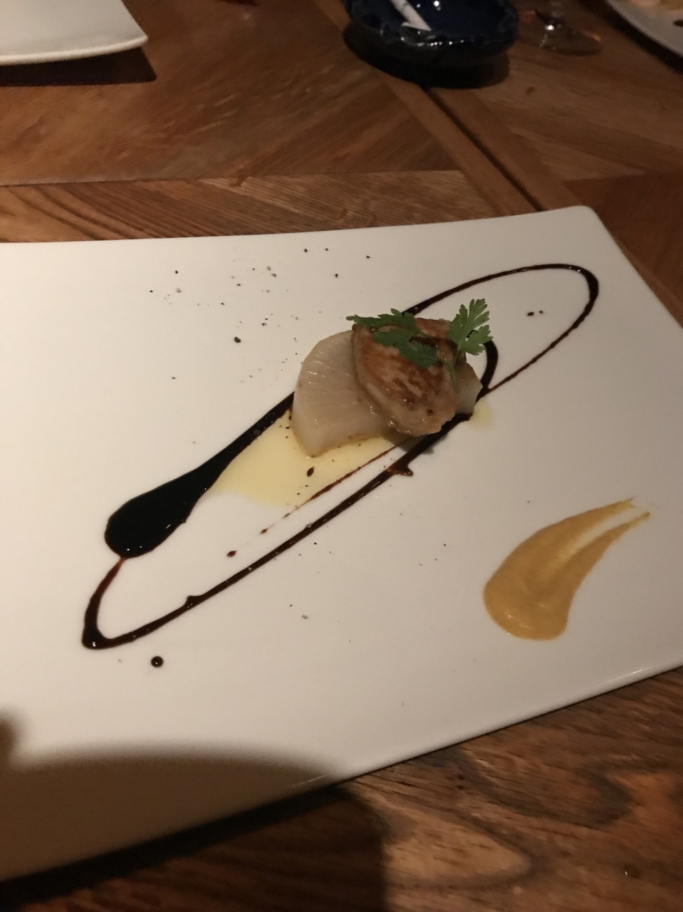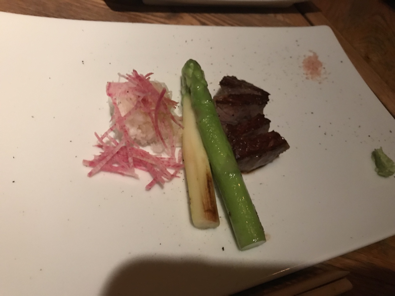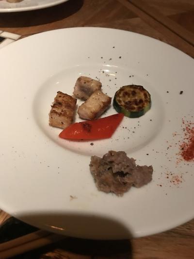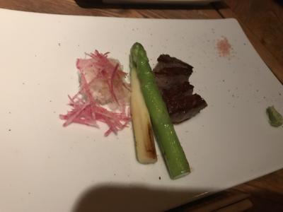 店内は満席。少し暗い感じだが、間接照明のせいなのか?。高級店だが、あまり硬くならなくても良い感じがしました。ズワイ蟹のサラダに始まり、焼ウニ、宮城県中トロのステーキ、伊勢海老の鉄板焼、フォアグラ大根バルサミコソース、口直しの生ハム、黒毛和牛のサーロインステーキ…というコースをいただきました。