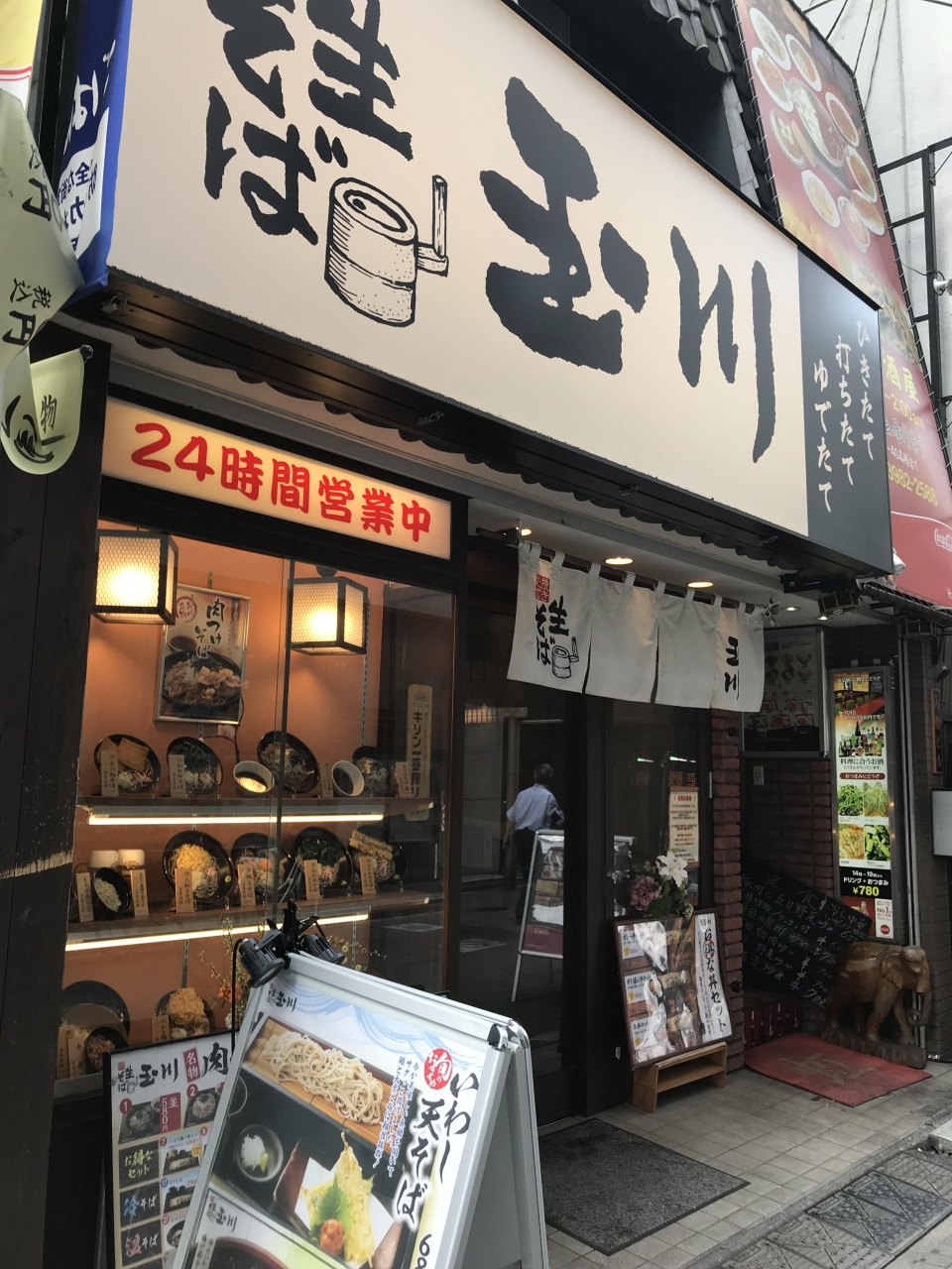 一応、立ち食い蕎麦屋に分類されるようですが、立ち食い場所はなく、カウンター席とテーブル席のみ。24時間営業で蕎麦以外に枝豆、塩辛、ハムカツ…といった一品料理も多くあり、酒類も豊富なので仕事終わりの軽い飲み会にも良いかも。