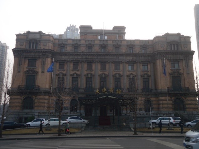 現在は中国工商銀行大連市分行になっているが旧大連市役所だった建物で、石碑に「旧大連市役所」と書かれている。