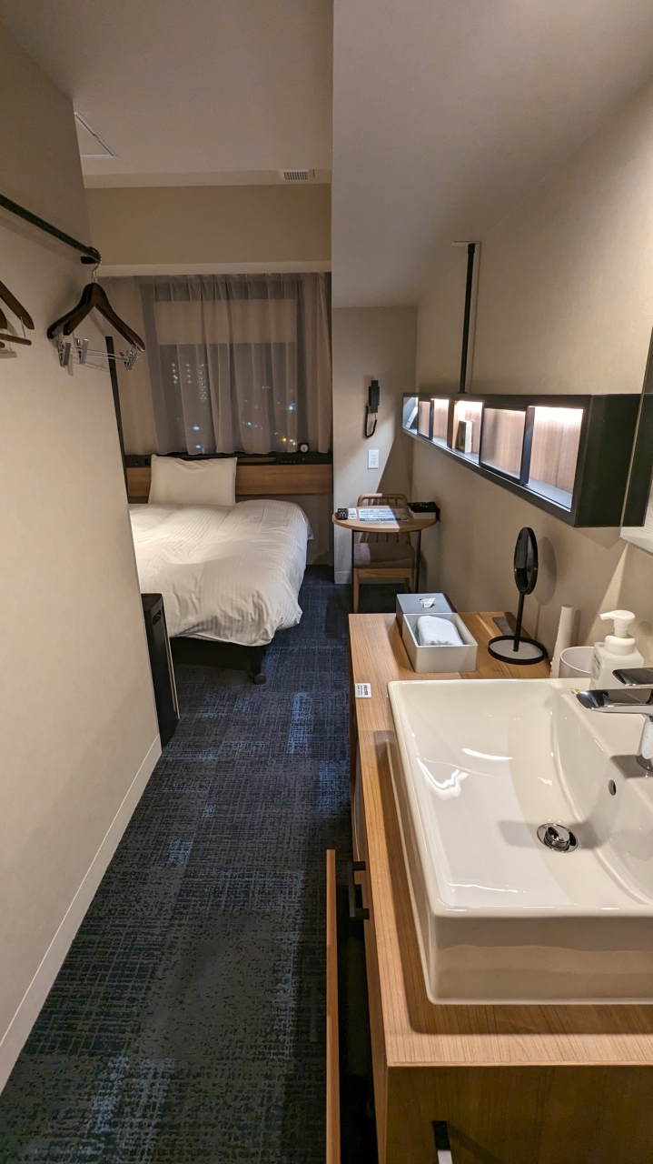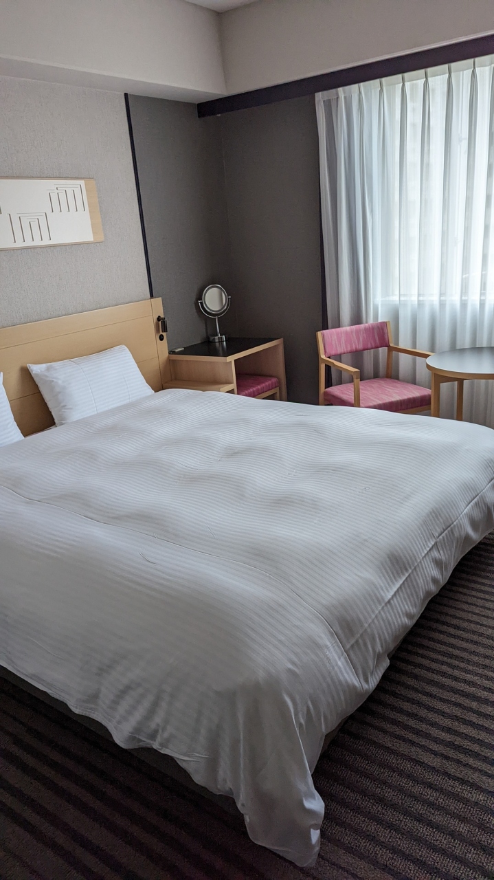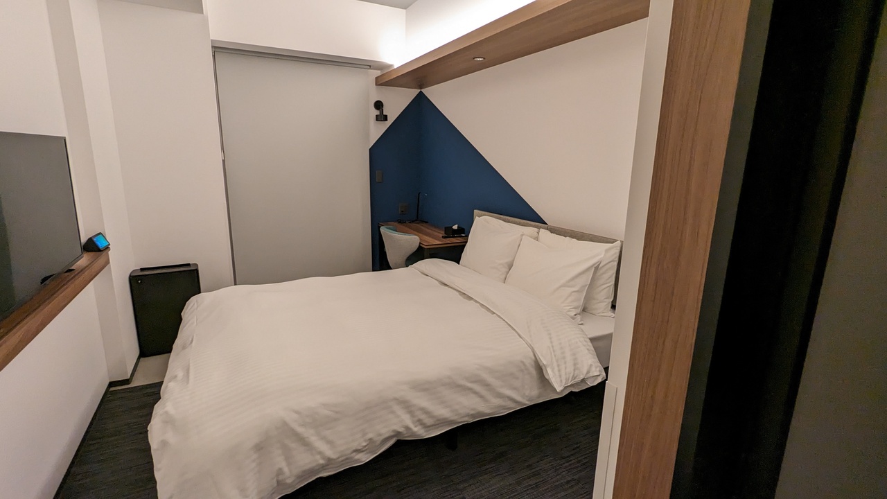 お部屋は15㎡ベッド幅も90cmと小さめですが、新しく清潔なので問題なし。
