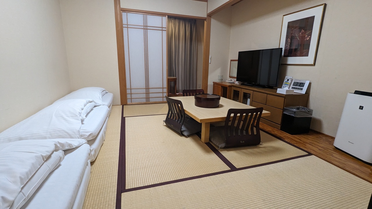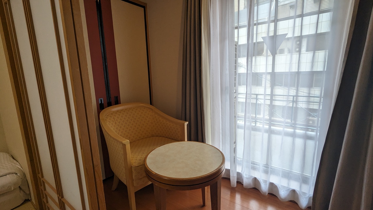 こちらのホテルに和室があることを知り、朝食付きプランで泊まりました。部屋は畳6畳に板の間スペースが付いていて、ここにテレビや冷蔵庫が置いてありました。縁側?スペースもあり1人用の椅子とテーブルがありました。3人まで泊まれるようで布団は3組用意されていました。