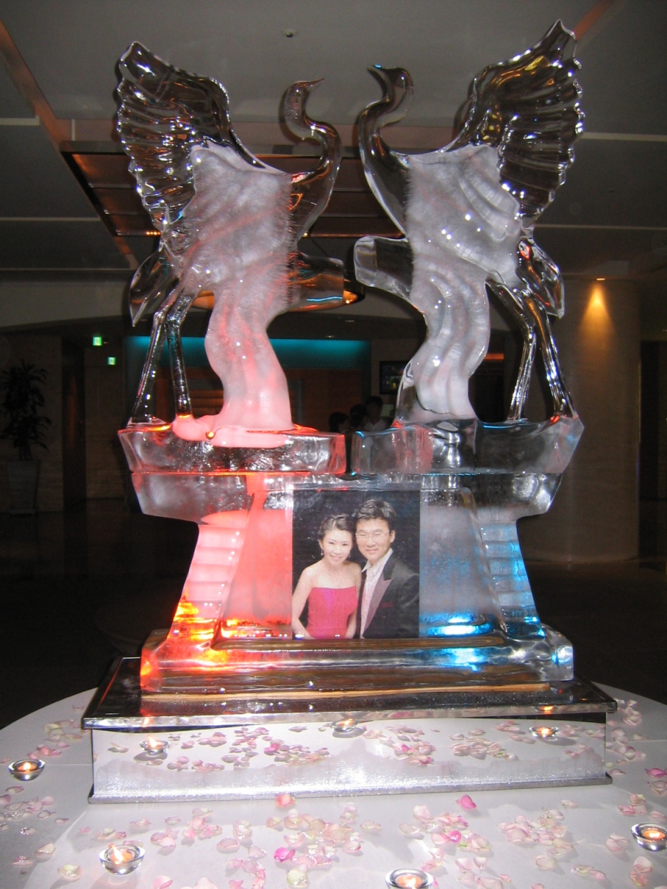 カジノで有名なシェラトンウォーカーヒルホテルで結婚式が開かれていました。もちろん中には入れませんが、入口に氷でできた彫刻を発見。2羽のスワンの間に二人の写真が飾られています。一昔前、日本のホテルの結婚式でも見かけたことがありますが^^