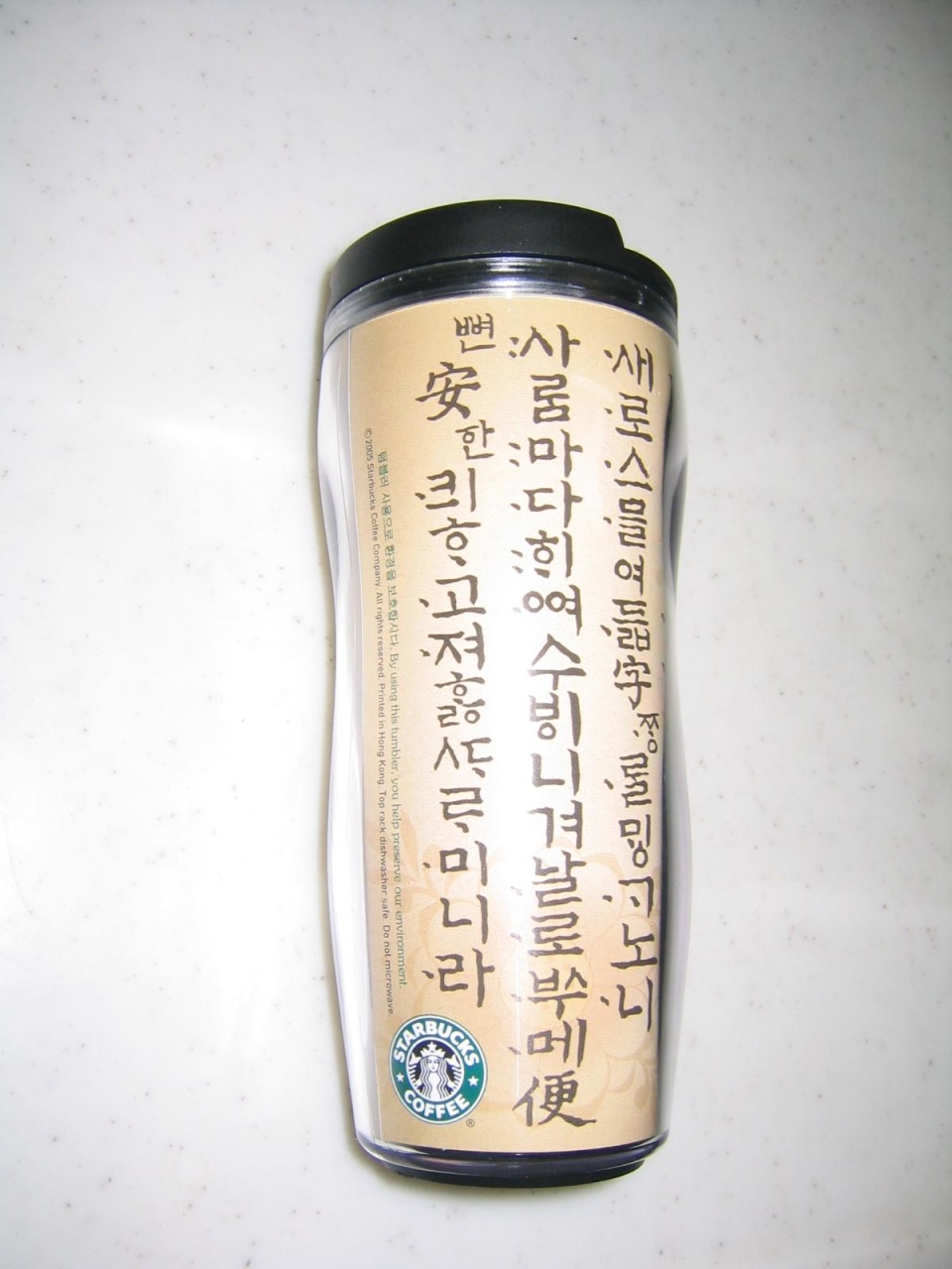 明洞のスタバでW14000でした。サイズは12ozとあるので大きめです。トールサイズくらいでしょうか。ハングルが一面に書いてあります。