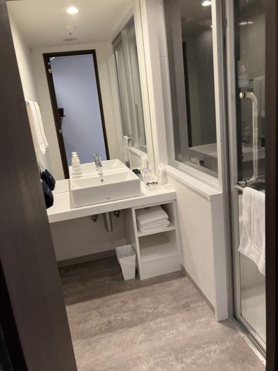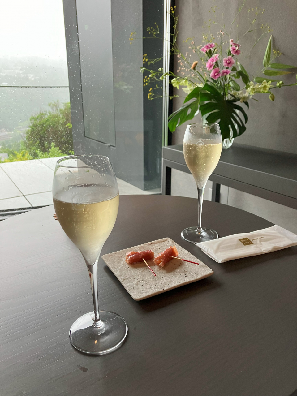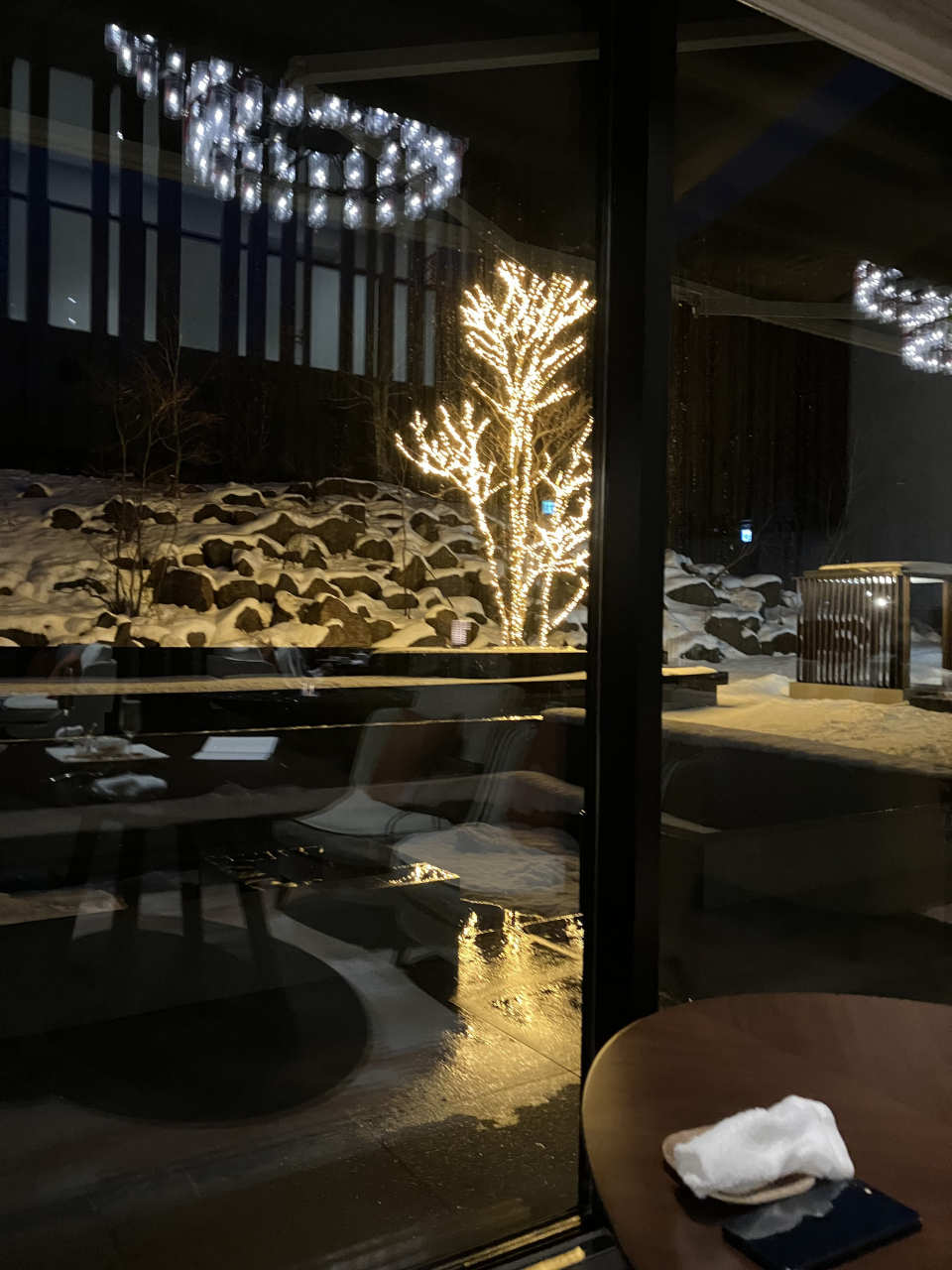 チェックインにはウエルカムドリンクとしてシャンパンがだされ、ラウンジには生ビールサーバーやいろいろな洋酒の瓶が並び、好きな時に好きなものを、という案内。そして部屋に行くとスパークリンワインが冷えている。大きなテレビモニターでルームサービスメニューが見られてオーダーできるという至れり尽くせりぶり。夕食もレストランかラウンジか選択できて、ラウンジを選択したら、他のお客さんは一組のみで、それも照明をかなり落としているから全く気にならない状況、朝食も部屋かレストラン、部屋を選択したら、本当にチェックアウトまで他のお客さんに全然会わなかった。超絶おこもり系だけど、のん兵衛には自制が求められる宿。