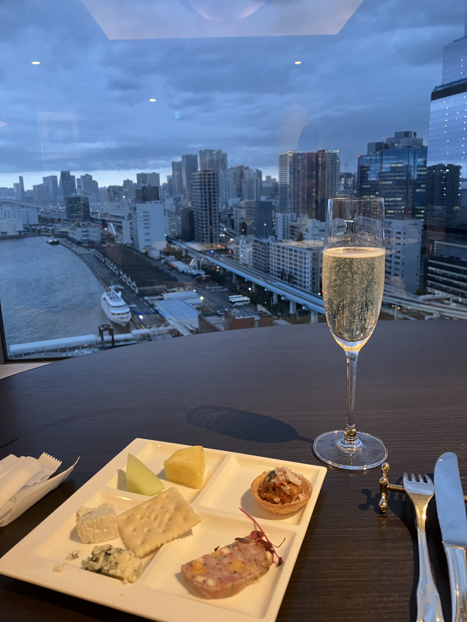 クラブフロアに宿泊すると、クラブラウンジが使える。ラウンジからは竹芝桟橋、日の出桟橋が見ろせて、東京湾クルーズ船とか八丈島行きの船とかが停泊しているが見える。ウエルカムドリンクはシャンパンが選べて、チェックイン時はアフタヌーンティータイムだからそれも出してもらえればご機嫌のシャンパン付きアフタヌーンティタイム。
