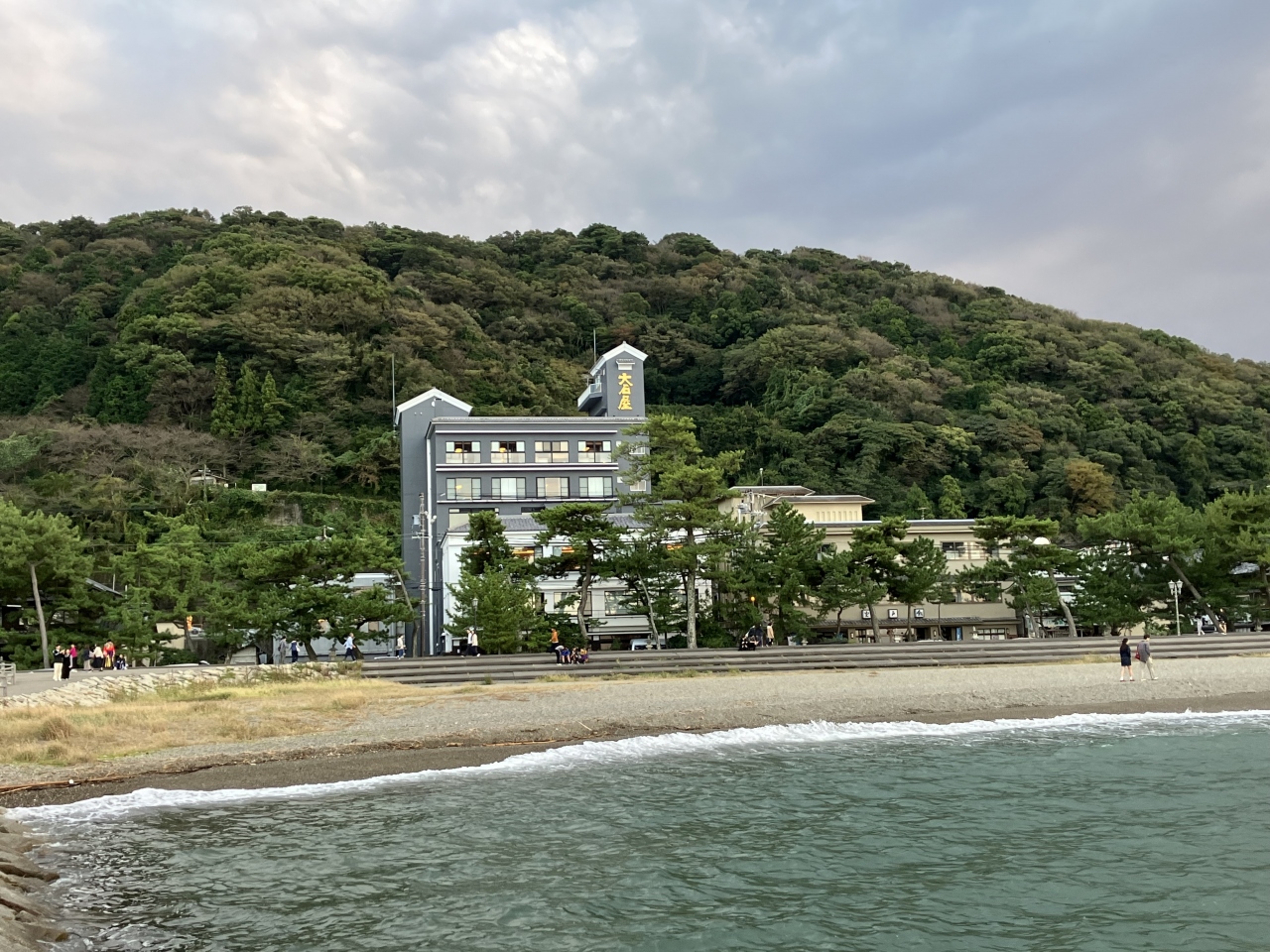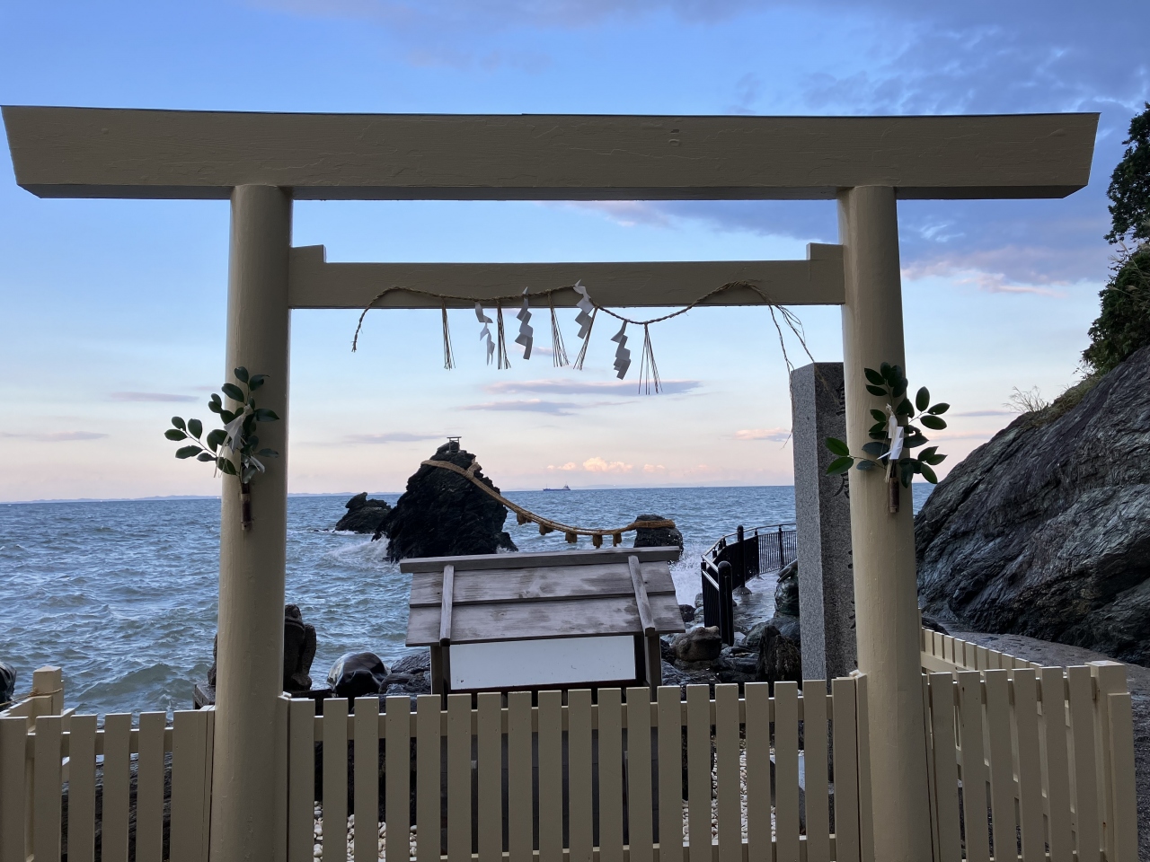 夫婦岩に一番近い宿です。二見浦駅から送迎もしてくれますが、二見置賜神社の鳥居直前で、車道がUターンしているんですが、そのギリギリのところにあります。目の前はその車道を挟んで海でした。お料理も盛りだくさん。