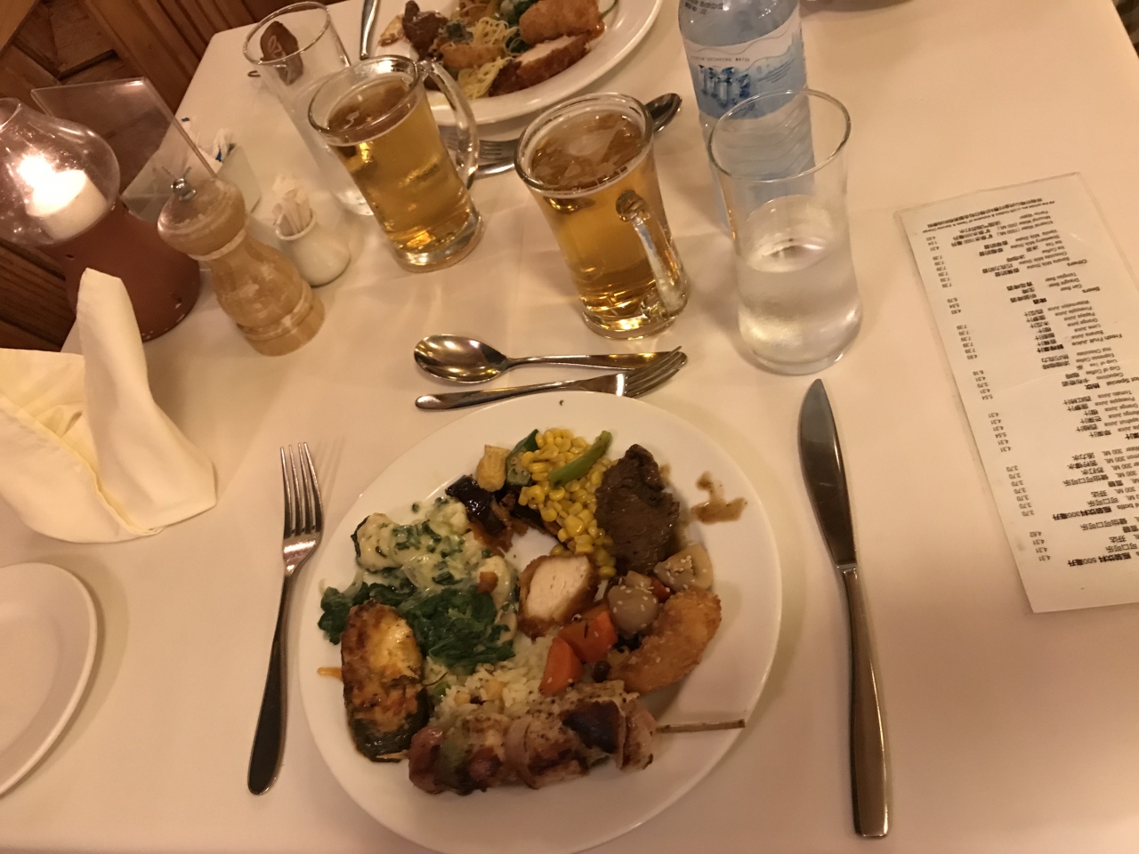 飲み放題はスタッフが忙しすぎてなかなか持ってこない。食事は5時半と8時の2交代で、どちらかチェックイン時に選びますが、時間的にどちらも微妙です。早すぎるか遅すぎるか。