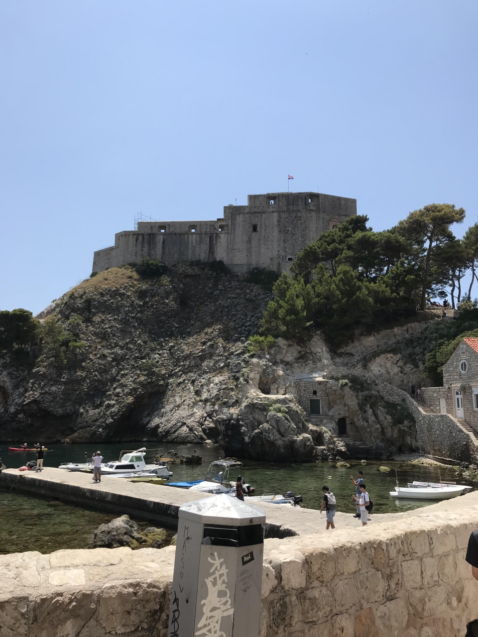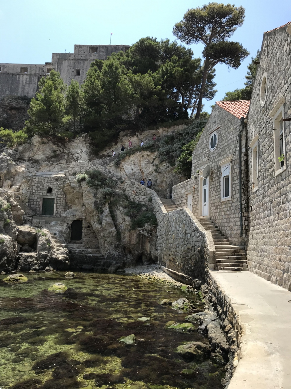 ピレ門を出て、アイスクリーム屋さんを過ぎてカフェの先を左に曲がると小さな入り江に降りる階段があり、かわいい小道を抜けると要塞を下から見上げる位置に出ます。