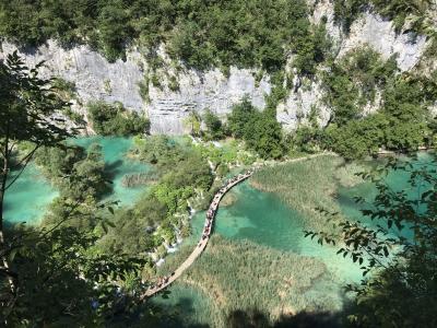 ホテルイエゼロに宿泊し、翌日に下湖群を回りました。エントランス2から入って、すぐST2からバスに乗り、ST1へ。そこからKルートに沿って歩き出すと、上に登って行きます。しばらくすると、プリトビッツェ国立公園の紹介でよく目にする写真、湖を渡る木道を見下ろすスポットがありました。