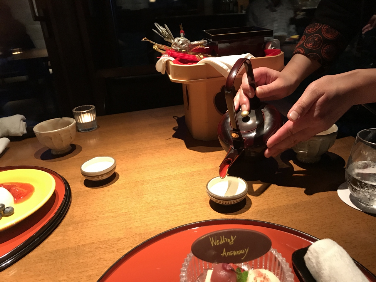予約時に結婚記念日の旅行と伝えていたら、サプライズでケーキとお酒を出してくれて、ちょっと嬉しかったです。また、ロビーの外で焼き芋を焼いていて、食後にお土産にもらいました。