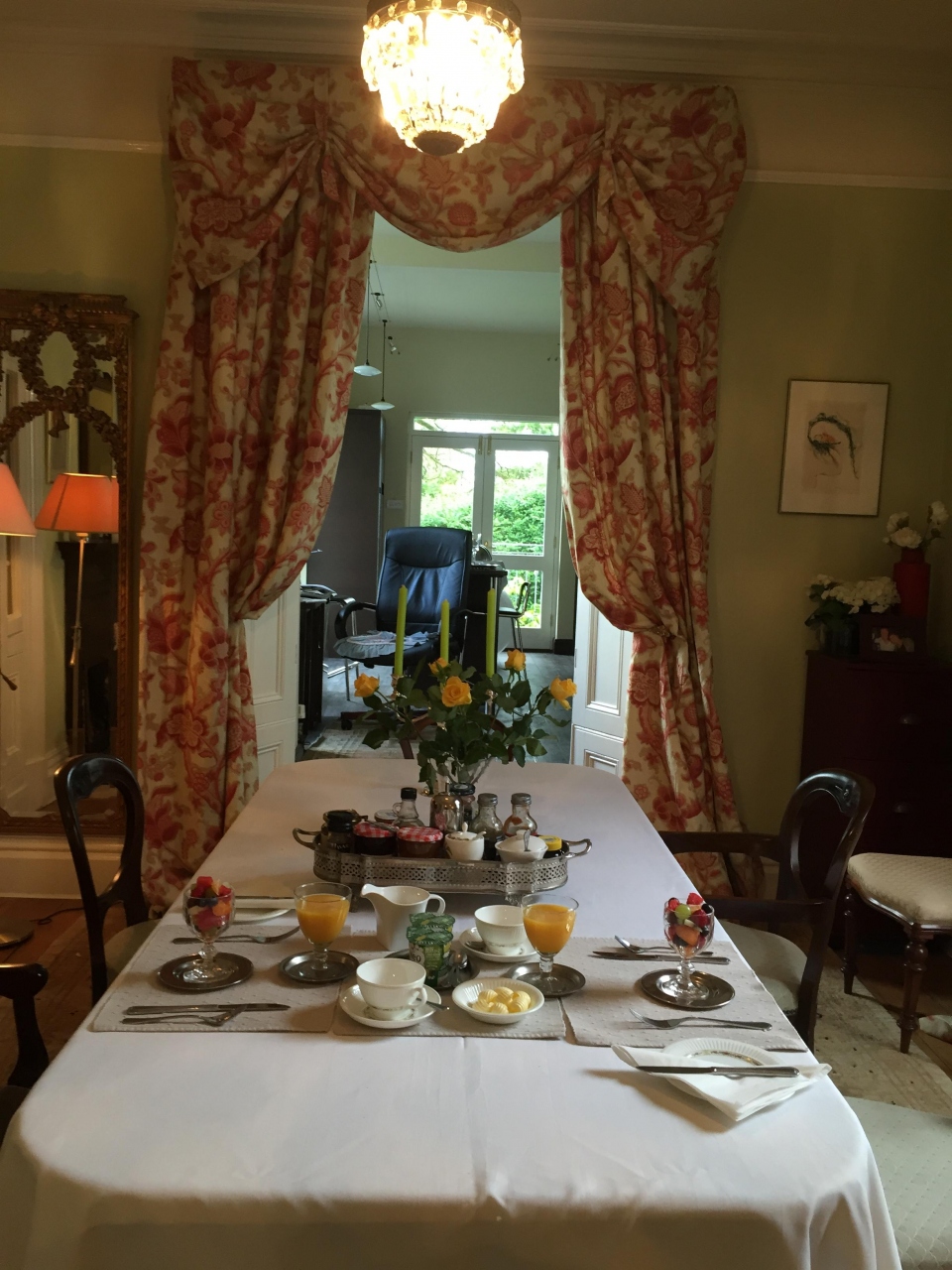 ウィンダミア駅から徒歩5分ぐらいのところにあります。部屋のテラス窓みたいなところから庭からダイレクトに入れるようになっています。部屋には屋内に通じるドアもあり、そこから階段を上って朝食の部屋に行けるようになっていました。朝食の場所は2階で歴史が感じられる陶器が飾ってあるカップボードなどもあり、いい雰囲気でした。朝食は前の日にオーダーシートを渡され、パンの種類や卵料理など選べるようになっています。伝統的なイングリッシュブレックファストを楽しめます。