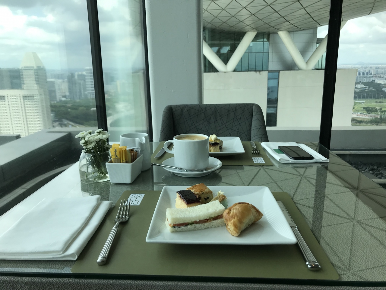 羽田発深夜便で、シンガポールに着いたのは朝6時半ごろ。そこから電車を乗り継いでホテルに到着、タワー1のフロント脇にあるサンズラウンジにクラブルーム以上のチェックインと書いてあり、そこでチェックインできました。