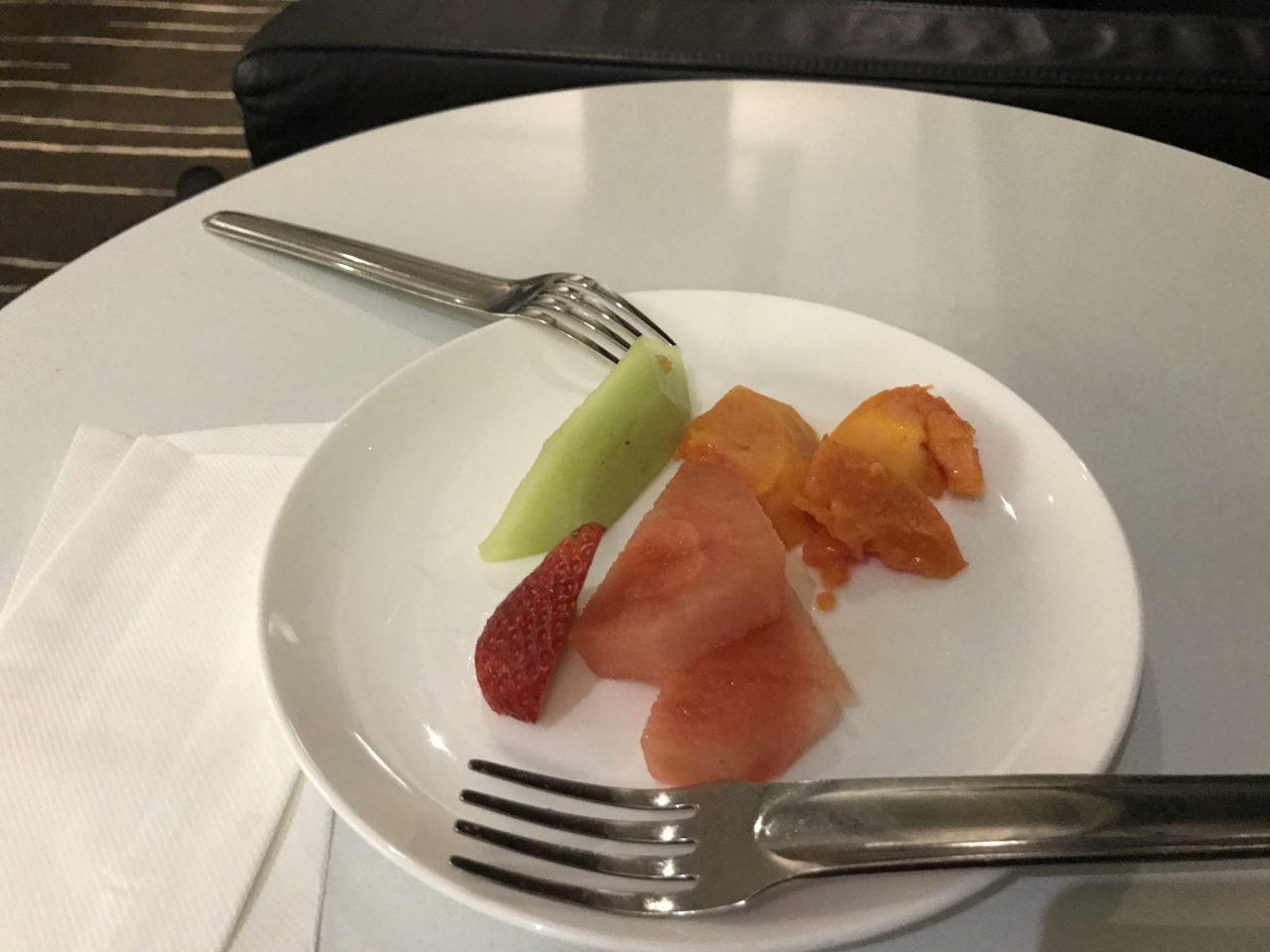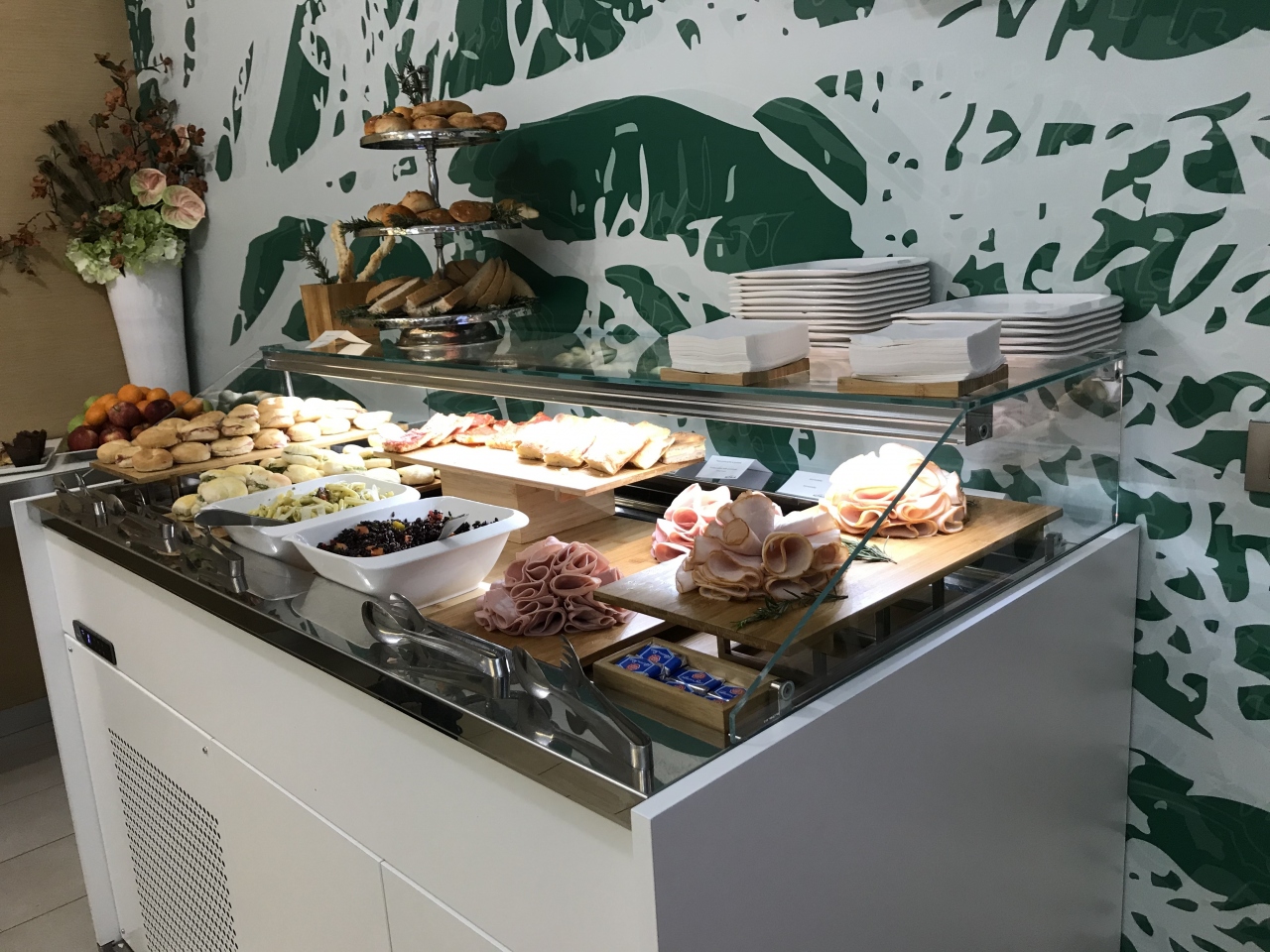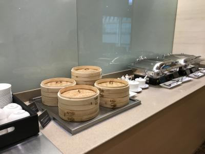 帰国時の早朝に利用しました。早朝だったからか、ガラガラでした。入ってすぐ右に曲がるとフードエリアがありました。すぐに飛行機に乗るので、フルーツぐらいしか取りませんでしたが、フルーツの他に、パン数種類、スクランブルエッグやハム、ソーセージ類、ヨーグルトなど、わりに普通の朝食だったと思います。冷凍ボックスがあって、アイスクリームがあって、ちょっと後ろ髪をひかれました。