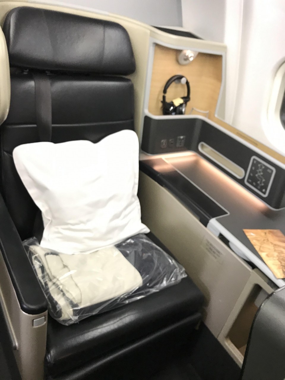 メルボルンからオークランドに行く際に、たまたまエアバス330のビジネススイートを利用しましたが、乗ってびっくりでした。座席が1-2-1の4列シートで、スタッガードとでもいうのでしょうか、サイドテーブルの配置が互い違いになっていて、個室感があります。わたしの座席は窓側にサイドテーブルがあって、通路を挟んで隣の座席は通路側にサイドテーブルがある、というように、隣同士でもあまり近接しないようになっています。カップルには不向きですが。エンターテインメントでは日本語対応の映画もありました。