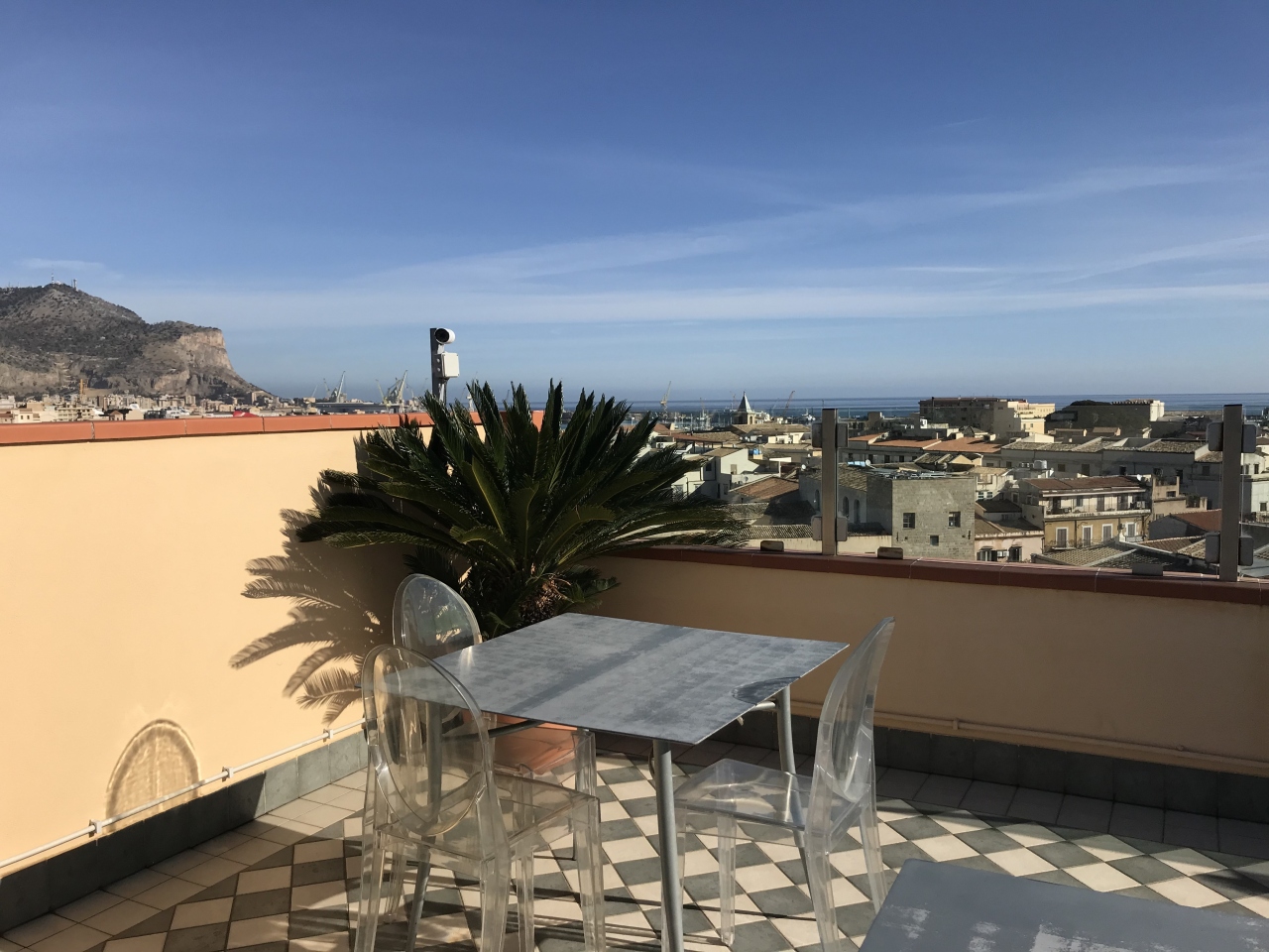 朝食会場はエレベーターで一番上まで上がって、さらに階段を登ったルーフテラスにあり、外でも中でも食べられる。そのルーフテラスからさらに階段があって、建物の一番上まで登ったらパレルモの景色を一望できた。