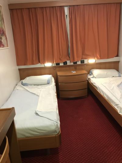 8時30分出港予定でしたが、結局乗船できたのは6時45分ごろで、徒歩の乗船者用のスロープを登るとエスカレーターが動いていて2階のレセプションまで上がり、カードのルームキーをもらって部屋に入れました。一応窓ありのツインで、狭いなりにトイレとシャワーがついていました。スーツケースは広げた状態でベッドの下に押し込んだ形で収納。