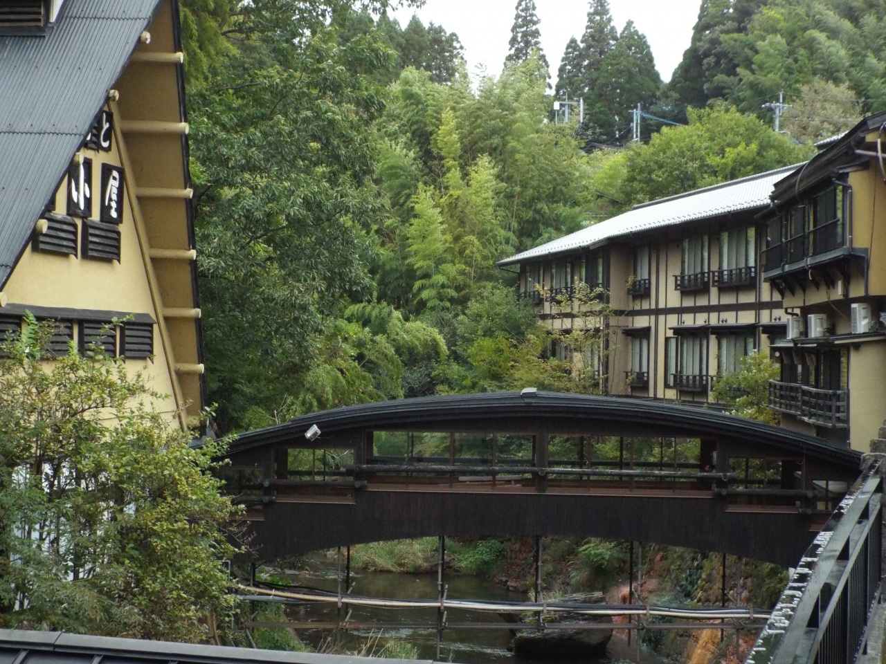熊本城を見学した後、菅乃屋で馬刺しとステーキを食べてから黒川温泉に向かったので、「ふもと旅館」に着いたのは午後6時頃でした。熊本市内から山道をクルマで約3時間走ったので少々疲れました。黒川温泉郷はちょうど有馬温泉をギュッとコンパクトにした感じで、坂が多く、小さな川が流れ、木々に恵まれた素敵な温泉町でした。道が狭く、曲がりくねっていることもあって、ふもと旅館に着いたのはチェック予定時間を1時間近くオーバーしていました。迎えに出て駐車場に案内してくれた番頭さんも、玄関で迎え入れてくれた女将さんや従業員の人たちも、私達を暖かく迎え入れてくれました。