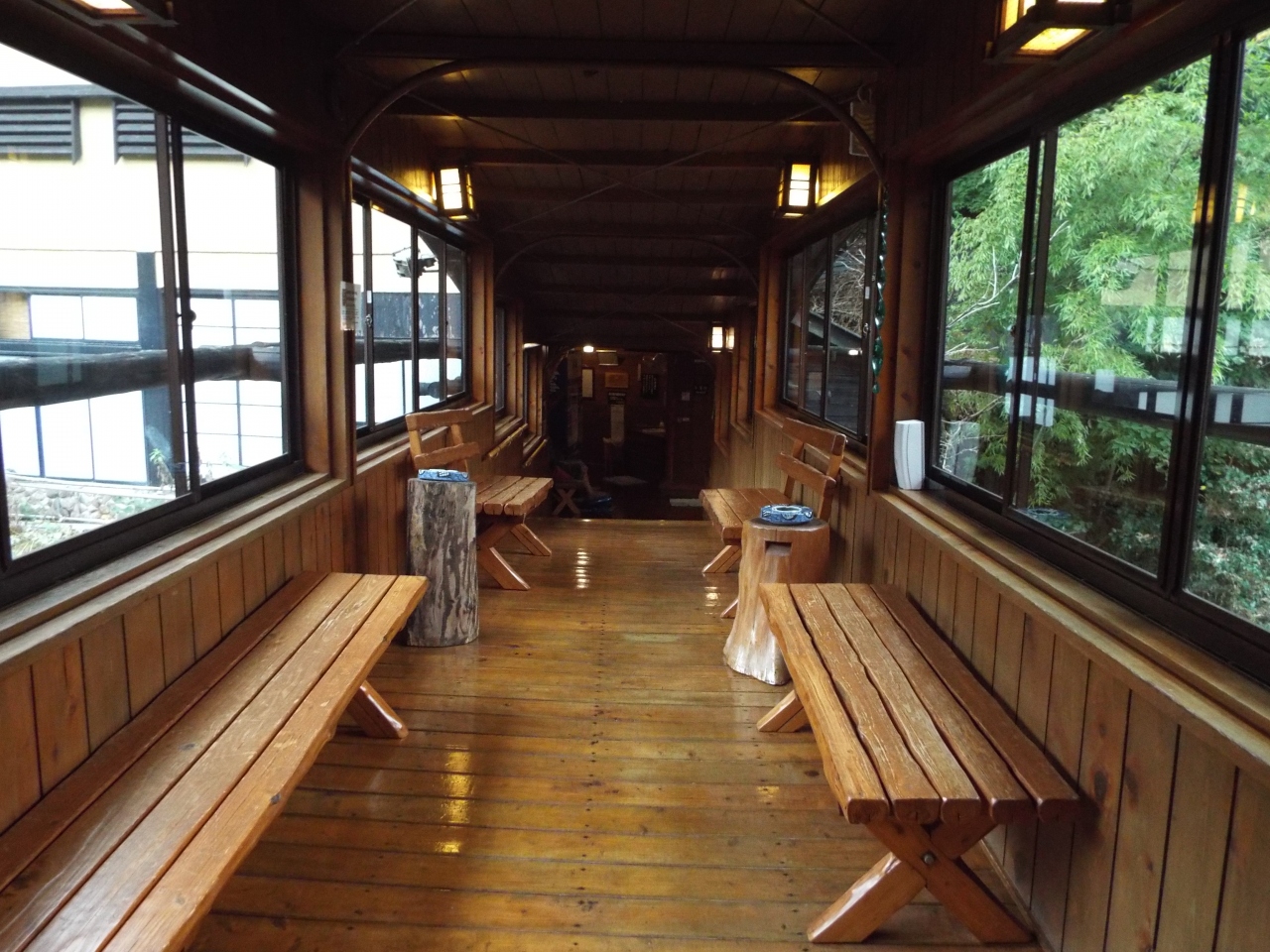 食後しばらくして、渡り廊下を通って、義兄と立ち湯に入りに行きました。階段状になっているのですが、深いところが150cmくらいあって、私の肩まできました。直径20cmくらいの丸太が横に渡してある訳が入ってみて解りました。- 旅行時期