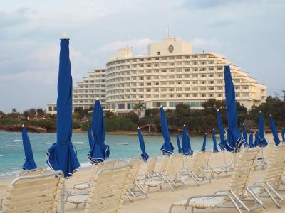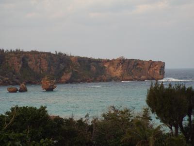 万座毛が一望できるホテルです。南側からしか見たことがなかったので、万座毛の全貌を見ることができ、その造形のダイナミックさに驚きました。おへその様に海に突き出た半島全体がこのホテルなので、空も海もビーチも独占したような気分になれます。2013年12月28日から3泊4日で行ってきました。東京から来る、1歳10カ月の孫を連れた息子夫婦を、伊丹からの我々夫婦が迎える形になりました。年末ということでかなりごった返していましたが、トヨタレンタカーを借りてから、お昼はソーキ蕎麦を頂きました。(詳細は旅行記をご参照くださいませ)