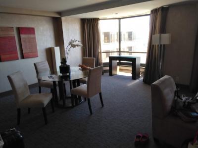 サンフランシスコ空港からBARTでパウエルステーション駅で降り改札を抜け右の出口をのぼり横断歩道を渡るとすぐエントランスがあり、ケーブルカーの駅も目の前 観光するにも最高の立地でした。ベルデスクは1階 フロントは2階にありエレベーターは乗る前に階数を押すタイプでした。今回はサンセットスイートに宿泊しましたが部屋はものすごく広くトイレも2つあり32階だったので景色も良かったです
