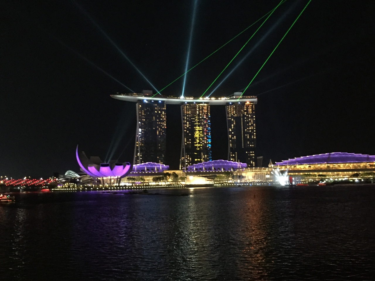 毎夜マリーナベイサンズで行われる水とレーザーのショーです。無料のイベントプラザから見ることもできるし、マーライオン公園から見ることもできます。どこから見てもとても迫力があっておすすめです。シンガポールにはこのような無料のショーがたくさんあるのがいいです。