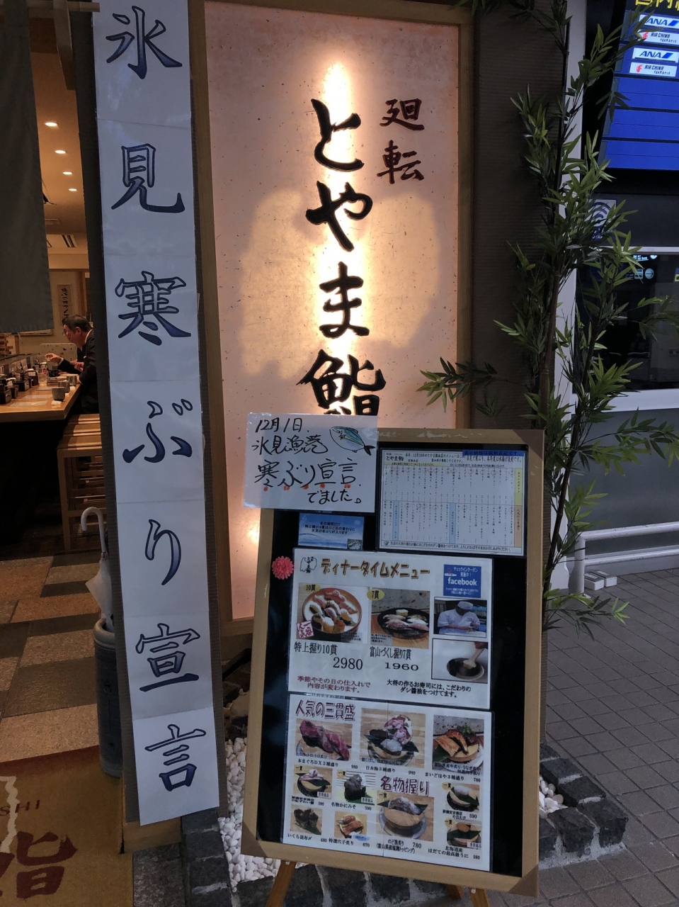 富山空港の中にある回転寿司の店です。空港内とは思えないほどのクオリティでした。のどぐろ、ぶりなど富山ならではネタも多いです。地酒やおつまみ系も揃っていました。最終便の前は観光シーズンは最後の富山グルメを求めて混雑するようです。