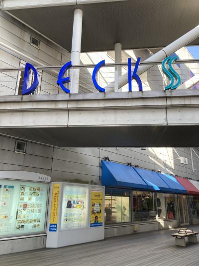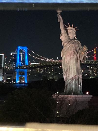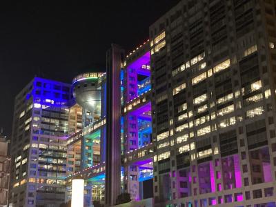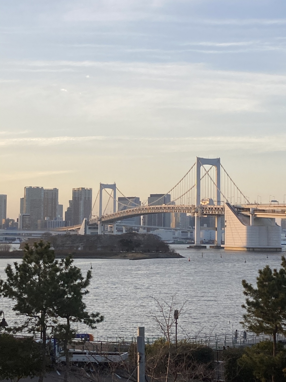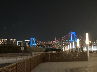 アクアシティお台場の前の通路です。天気がいいとレインボーブリッジや都心の高層ビル群や東京タワーを一望できます。特にデッキから見る夜景は素晴らしく、散歩には最適です。今だとオリンピックのモニュメントなどもありました。