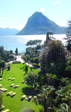 ホテルの緑美しいお庭と、静かなで、キラキラ優しく光るルガーノ湖。