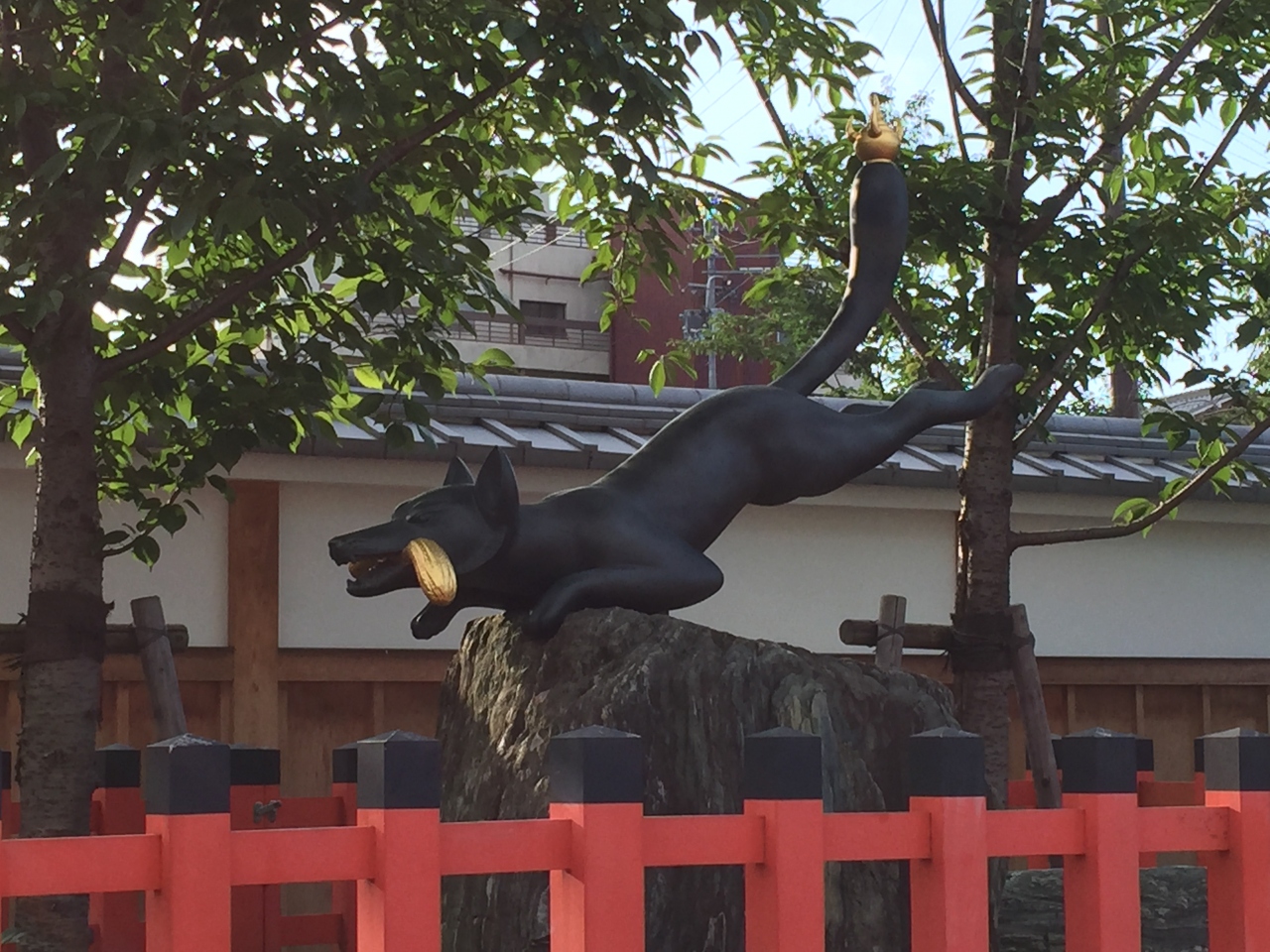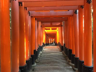 京都伏見稲荷に行きました。いつも込んでいる&夏の昼間は暑すぎるということで、ホテルを近くにして、朝6時に出発しました。さすがに6時台の伏見稲荷は近所の方がウォーキングしているぐらいであまり観光客はいませんでした。そのおかげでゆっくりとみることができました。参道を抜け、本殿を抜け、いざ千本鳥居に。朱色の鳥居が重なりあり、つながる様はまさに圧巻。しばらく行くと、遠くにその鳥居が1本だけ、神々しく金色に輝いているではありませんか!実は、朝日が木々の間から差し込みその一本だけを照らしていたのです。なんか得した気になりました。