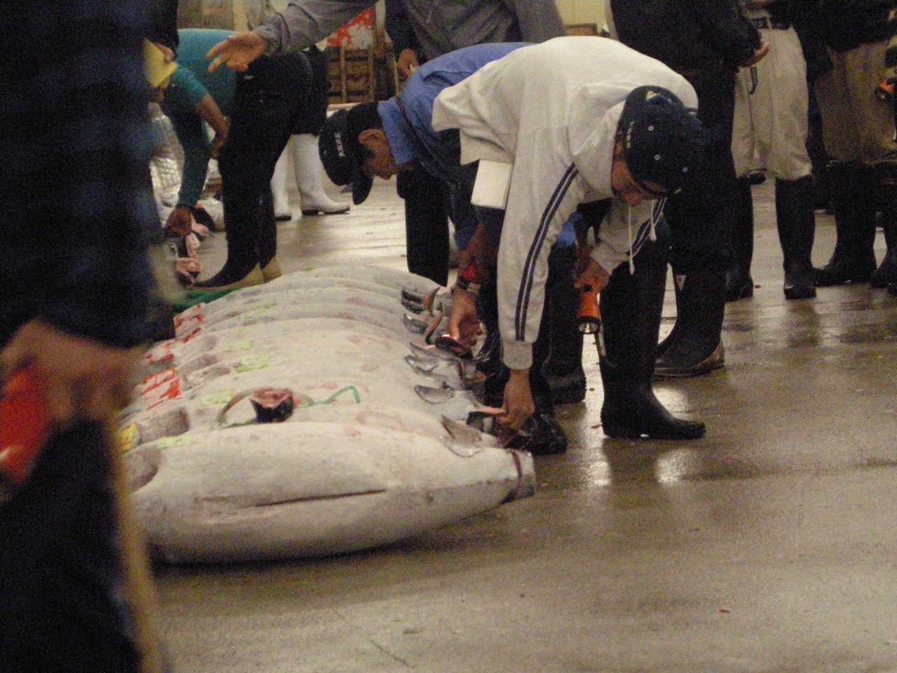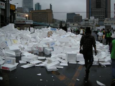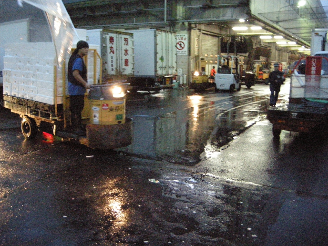 築地市場のマグロのセリの見学に行ってきました。HPでは受付開始は5時となっていますが、最近は人気ということもあり、周辺の交通事情の件もあり、3時から受け付けが開始(4時頃には受付終了してました)。そこから5時15分ぐらいまで寿司詰め状態の待合室で待機させられます。座るのがやっとのスペースしかもらえません。まわりはほぼ海外からの旅行者で、日本人は私たちともうひと組ぐらい。そこからセリの場所までターレと呼ばれる電動3輪車が交錯する市場内を移動します。セリの会場に入れられた後は何の説明もありません。勝手に見て帰れって感じです。しかもセリの時間はほぼ10分もありません。あっという間でしかも何をやっているかは素人にはほぼ分かりません。何ともこれがなぜにこれほどの人気なのか?って感じでした。また、警備の方の待機者に対する扱いは最悪。まるで動物を扱うような態度で指示をしていました。いくら無料で、しかも仕事をのぞき見させてもらう立場だといえ、これではちょっと・・・せっかくの海外からの方々もうんざりな顔をしてましたよ。