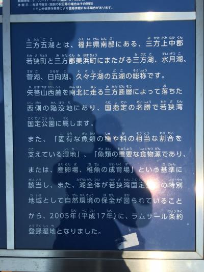 舞鶴若狭自動車道にあるパーキングエリアである三方五湖パーキングエリア。2014年7月20日の小浜IC - 敦賀JCT間の開通と同時に開業した、まだ真新しいPAです。ここからは若狭湾国定公園に属する三方五湖が眺められます。湖を眺めていたら、職員の方がこの湖に関してのお話をして下さいました。湖の近くには宿泊施設もあります。