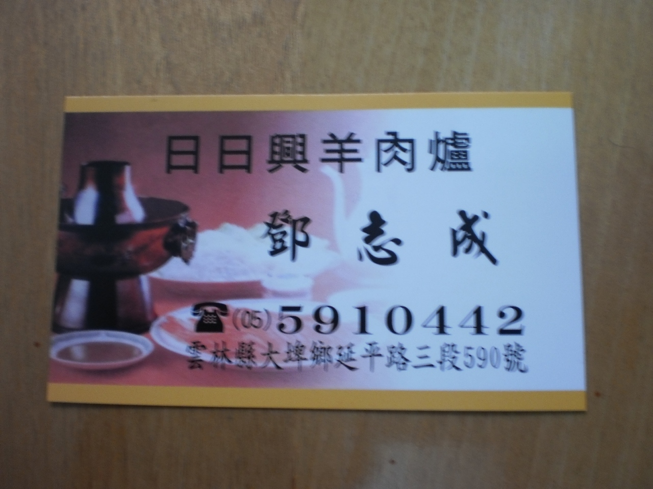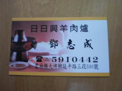 臺灣嘉義縣に接する雲林縣大[土+卑]郷延平路三段590號にあるお店です。地元の方々が知る人ぞ知る羊肉(やんろう)の名店です。ランチタイムを過ぎて、夕方近くに行きましたが、客の出入りは、ありました。以前は、この店の隣あたりで羊の解体も行なっていたそうですが、今は、見られません。その日に捌いた羊しか扱わないそうです。湯頭(スープ)も店前の厨房で大きな寸胴2台で煮込まれていました。