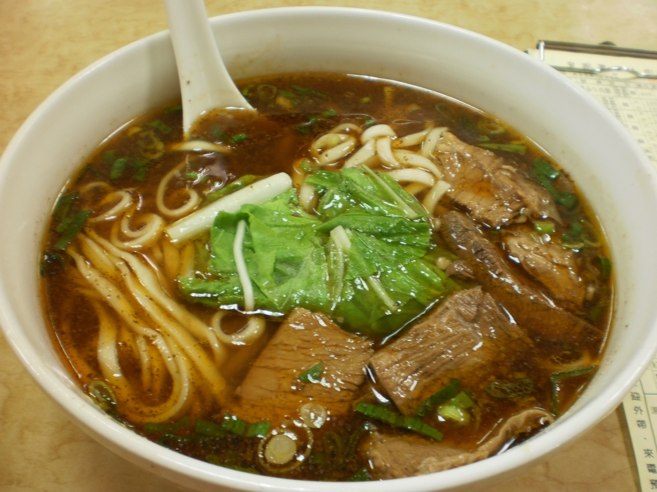 紅焼牛肉麺(@130元)は、丼が大きく、日本でいう札幌味噌らーめんの手もみ麺風の量は、少ないかなと思いましたが、煮込まれた牛肉(臺灣黄牛?)が腹持ちになりました。会計後、ここの發票は、レシート式でなく、3連複写式です。- 旅行時期