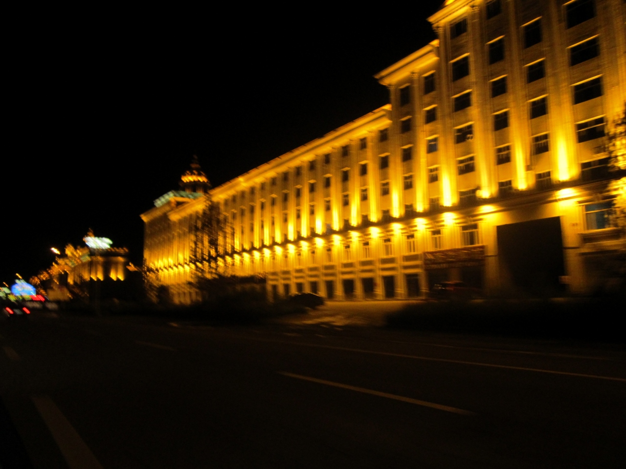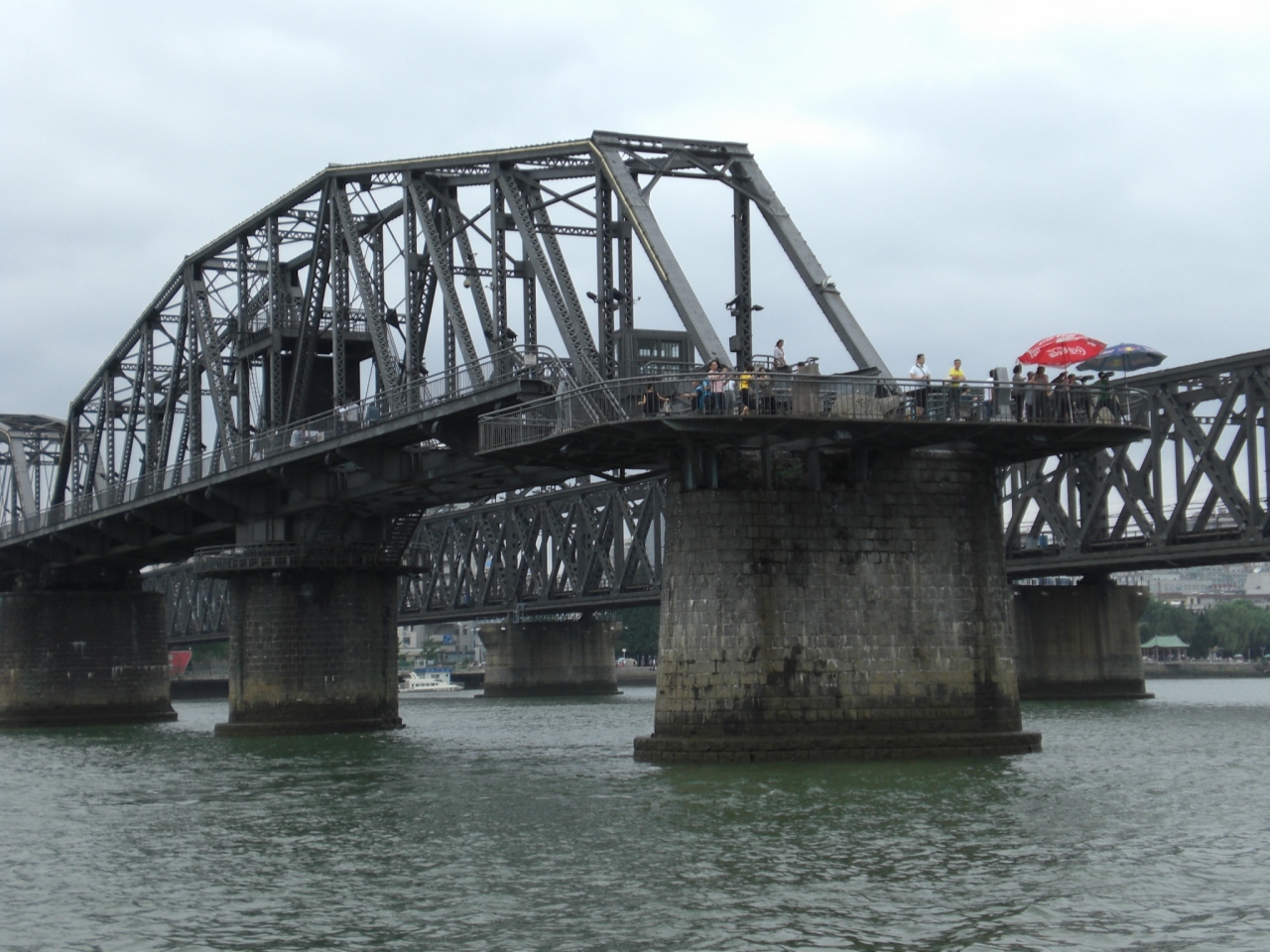 この通りは汽車駅の前を通り、一直線に河まで続いている。よって、3F以上に泊まれば正面に河手前の公園モニュメントが見え、河向こうは北朝鮮となる。6F以上なら断橋も見える。