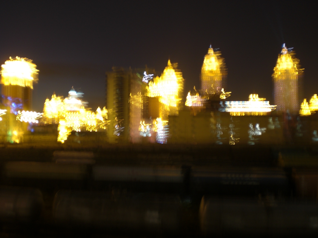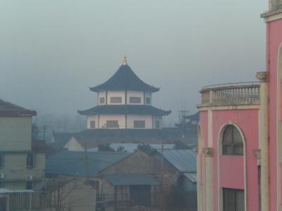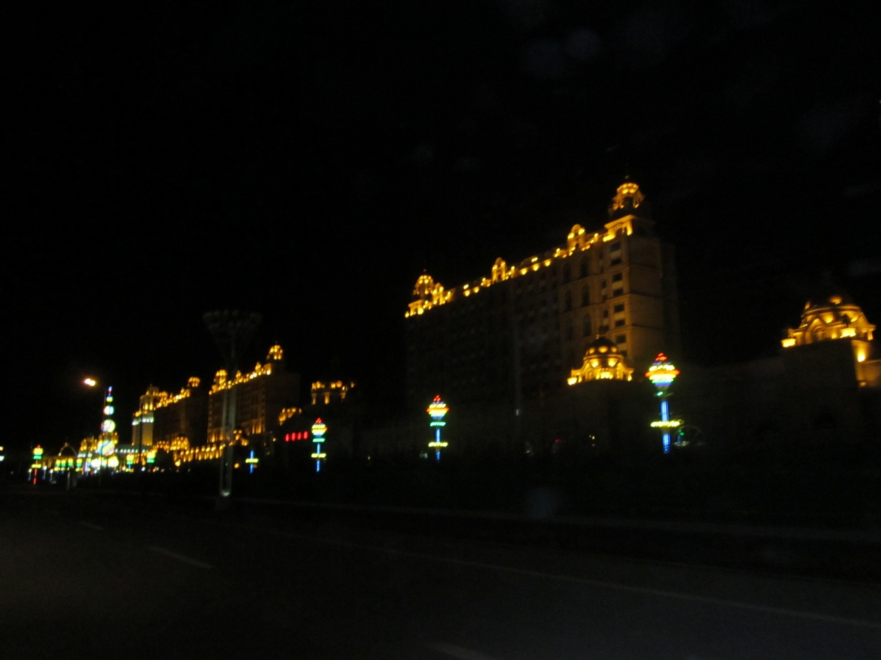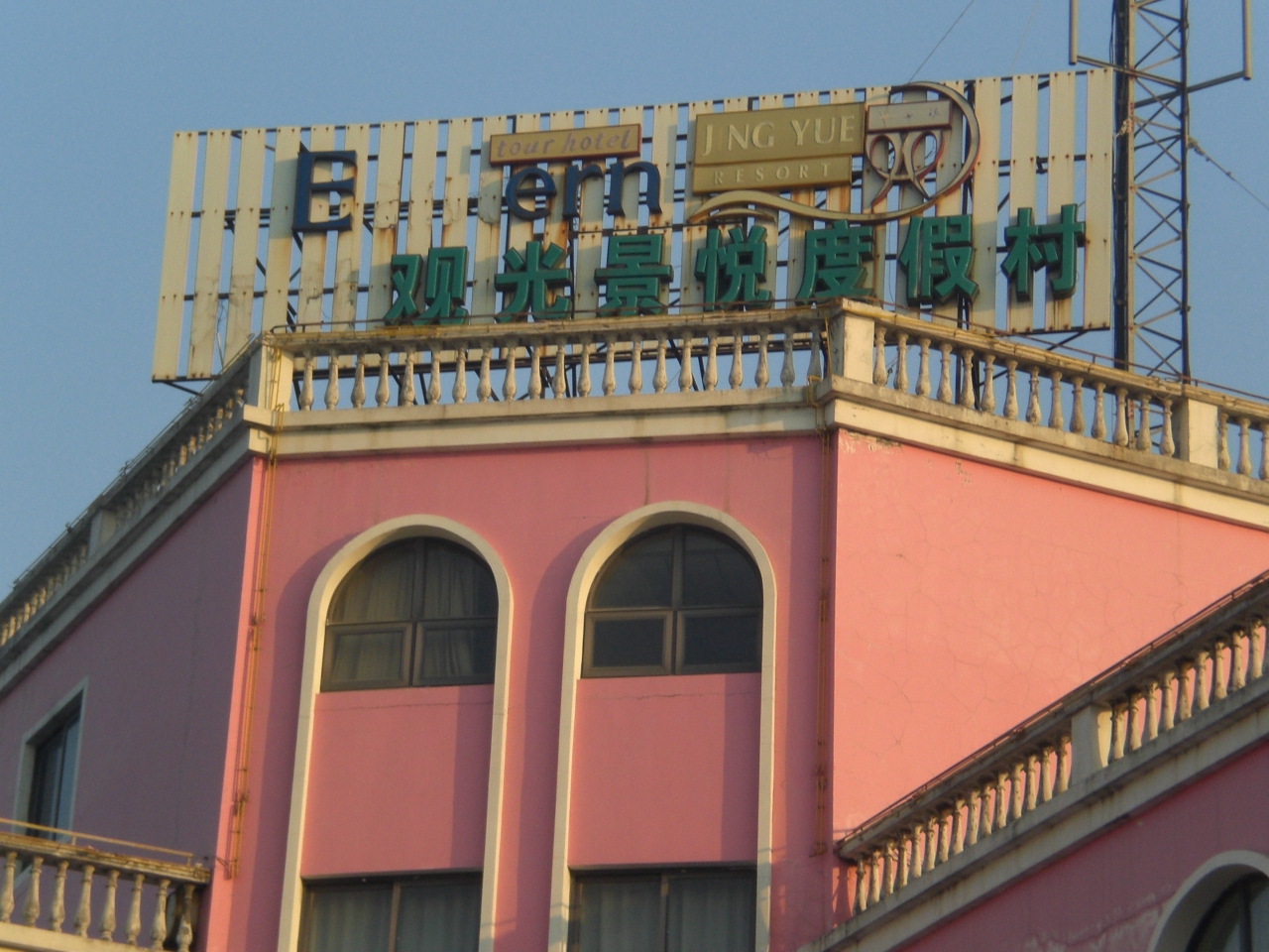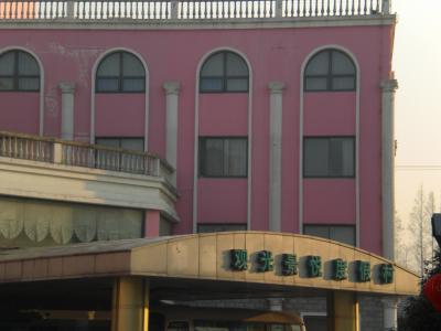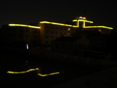 バスが来ていなかったので、タクシーに乗って向かったが運転手も場所が分からず、川六公路まで行ってうろうろしていた。時間も40分以上掛かり、支払いも70元を超えた。あたりに灯り一つ見えない道路をたまたま通る人に聞きながら着く始末。というのも周辺は川からの砂利取りの工場というか、コンベアーやトラックが並ぶ所にあるためだ。ポッと浮かぶその姿はピンクの外観、きんきらのイルミとあいまって、昔の郊外のモーテルにしか見えない。ここに1人で泊まるのかと思ったら少し寂しくなった。ただ、丁度ロビーに入った所で空港からの送迎バスがつき、10名近いお婆さん方が降りてきて、一気ににぎやかになったが。次の日、朝5時頃からバタバタしていたので、たぶん香港、台湾へのトランジットと思われる。スタッフとは中国語だやりとりしつつ、こちらが外国人と気づいたお婆ちゃん方とは英語で会話となった。