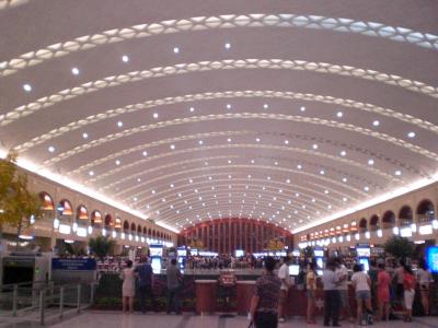 空港前は小さな広場の向こうに線も何もない空き地が広がっており、そこが迎えの車やタクシーの駐車場。そんななので、タクシーは1,2列で頭を空港に向けて適当な間隔で止まっているだけ。写真撮っていたら、タクシーが全部いなくなった。何せ20台もいないのですから。結局40分待って、次の便の客待ちに来たタクシーに乗り込む。