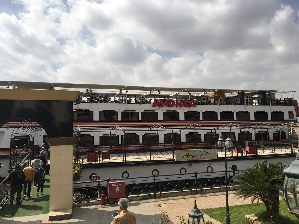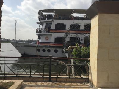 桟橋を渡って船内に入ります。ツアーで行ったので料理は豆中心のエジプト料理でした。とても健康的な料理ですが、日本の多種多様な料理に慣れた身には