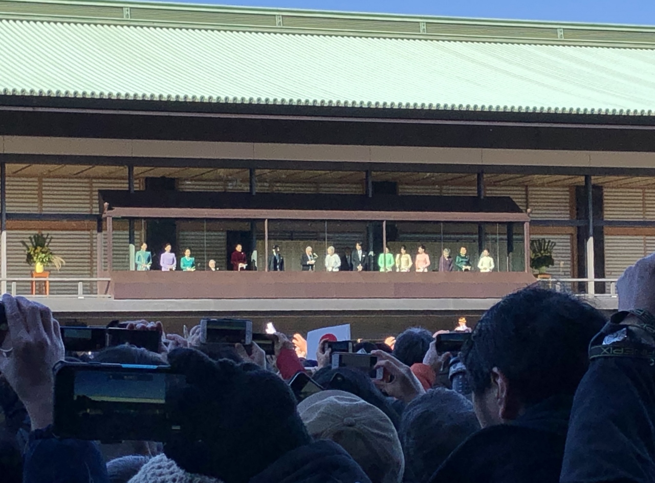 最初のころは思ったより若い方が多いと思いました。数年経つと外国の方が多くなりました。ここ2.3年は全体に以前より多くなった感じでしたが、2019年の今年は今までで一番多く、待ち時間も今まで以上でした。前のほうで見たい場合は次の回まで1時間待たなければいけませんが一度参賀を終えて出ないで前のほうに行くことです。
