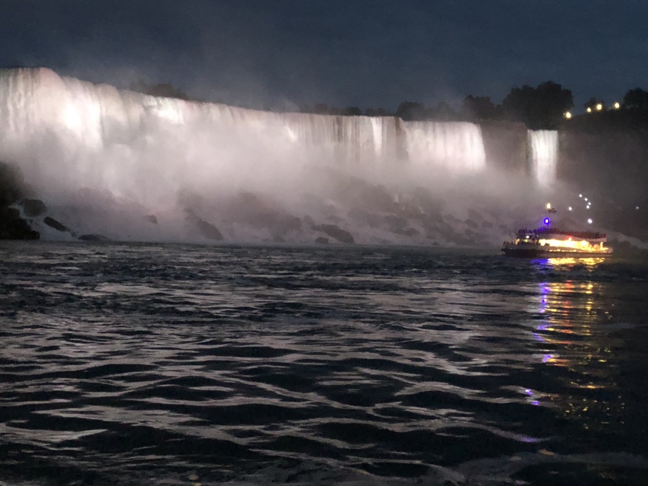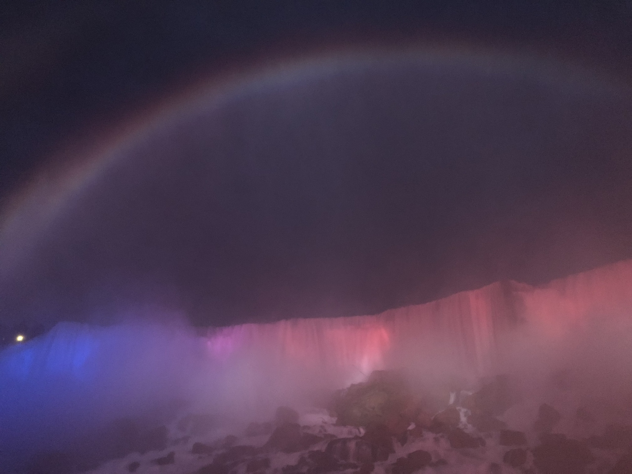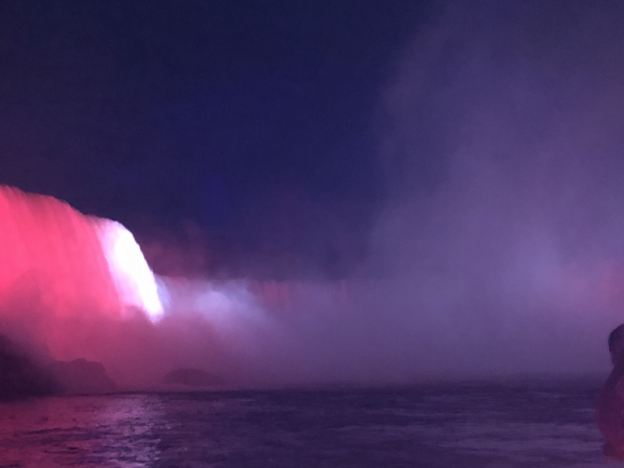 夜間ライトアップされた滝をクルーズしましたが赤や青にライトアップされた