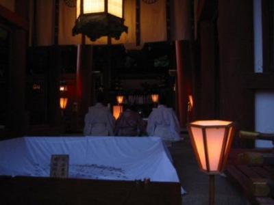 ご本殿。宮司さんがお祈りをささげています。この中に瑠璃色の灯篭があると...