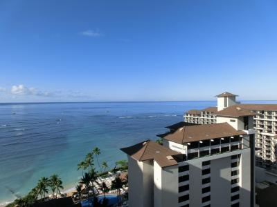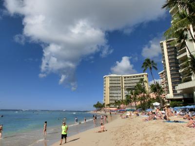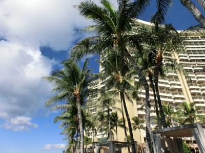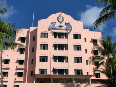 ビーチから見たロイヤルハワイアンホテル。ピンクですね。ピンクパレスの名...