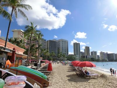 ロイヤルハワイアンホテル前のビーチです。ビーチチェアがきれいに並べられ...