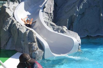 サンハトヤは伊東にあるファミリー向け温泉ホテルです。家族旅行だったので、とにかく子どもたちが楽しめるホテルを探し、プールが充実しているサンハトヤを選びました。写真のように、ウォータースライダーで子どもたちはとても楽しめます。食事もバイキングで子どもたちの好きなものを食べられるのもよかったです。