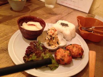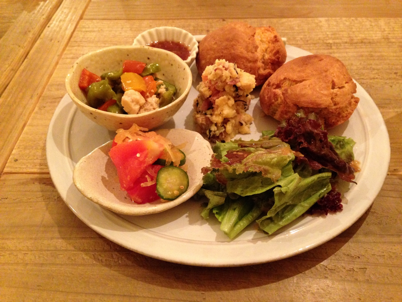 スコーンランチは手作りのいちごジャムが美味しいです。惣菜は大豆とひじきのポテトサラダ(美味しい!)、トマトと南京の酢の物(さっぱりして美味しい)、万願寺とうがらしと厚揚げの炒め物。