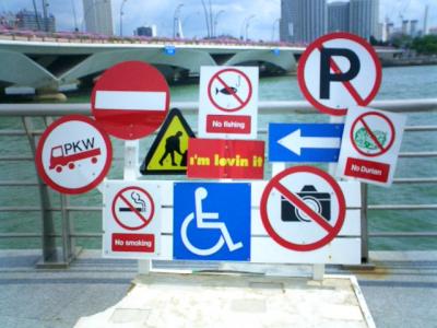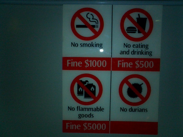 駅の中には写真の様な看板があります。喫煙で$1000罰金。飲食で$500罰金。燃えそうなモン持ち込んだら$5000罰金。ドリアンは持ち込んだらダメだけど罰金はナシ。- 旅行時期