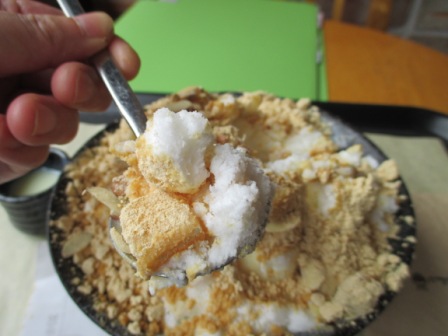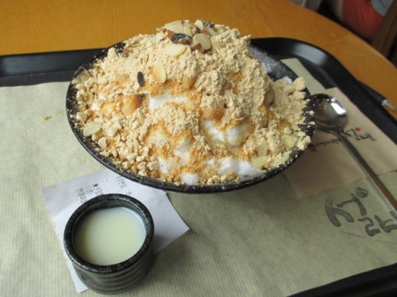 細かく刻んだお餅、アーモンド、たっぷりかかった黄な粉に練乳をかけていただきます。